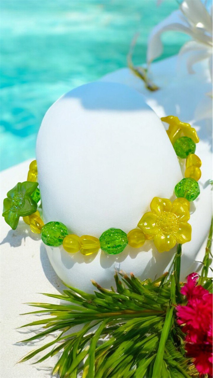 Pulsera de aprox. 16cm de largo, con cuentas y flores de plástico en tonos amarillos y verdes e hilo nilon transparente