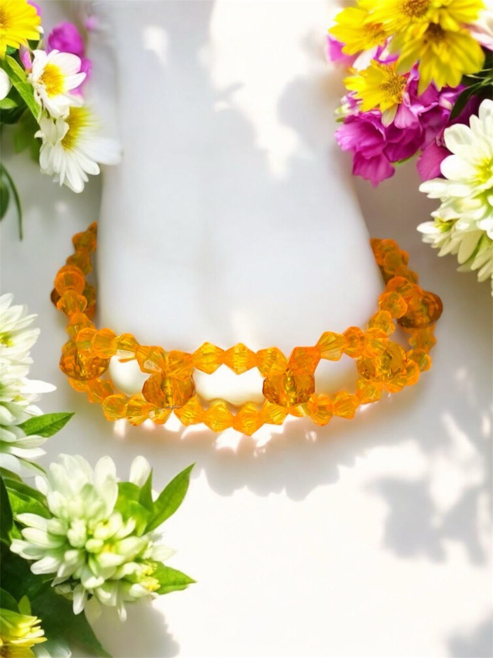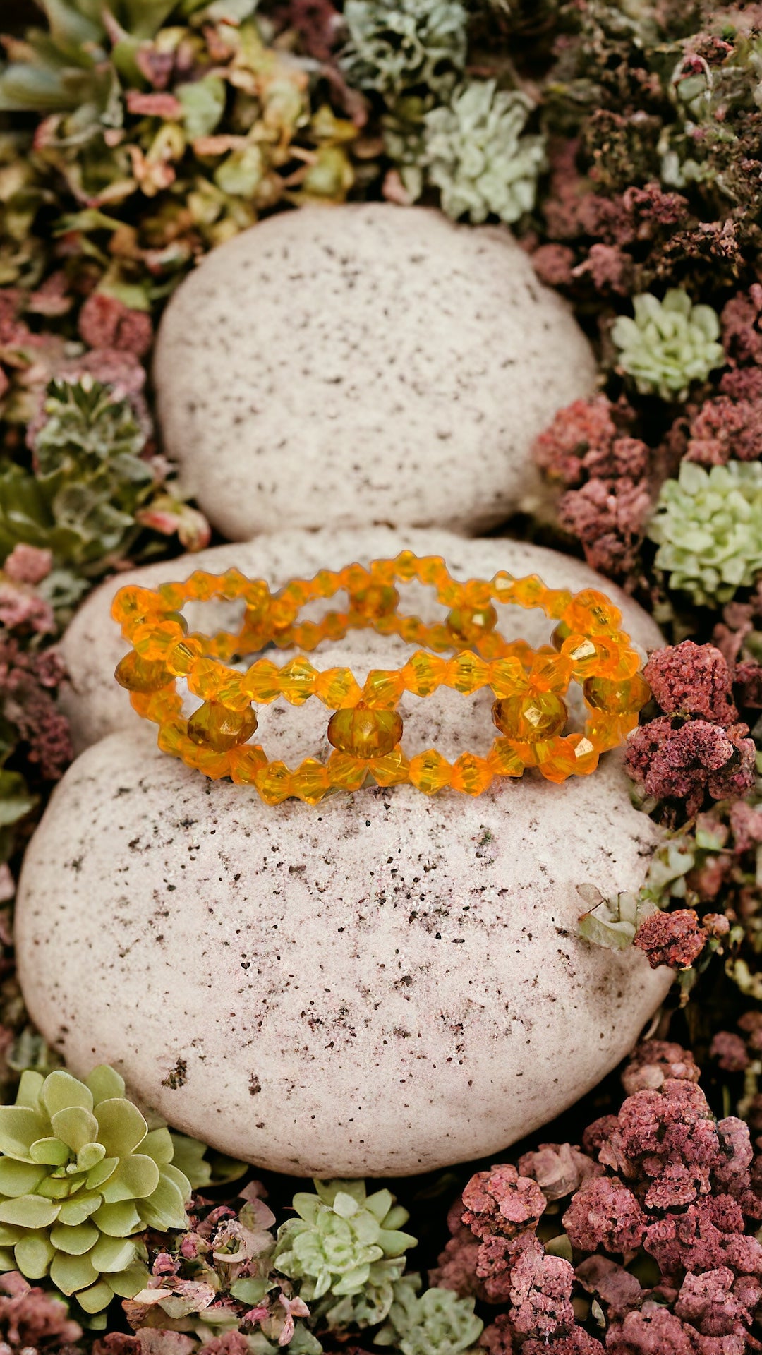 Pulsera de acrílico e hilo elástico de aproximadamente 16 cm de largo en color naranja.
