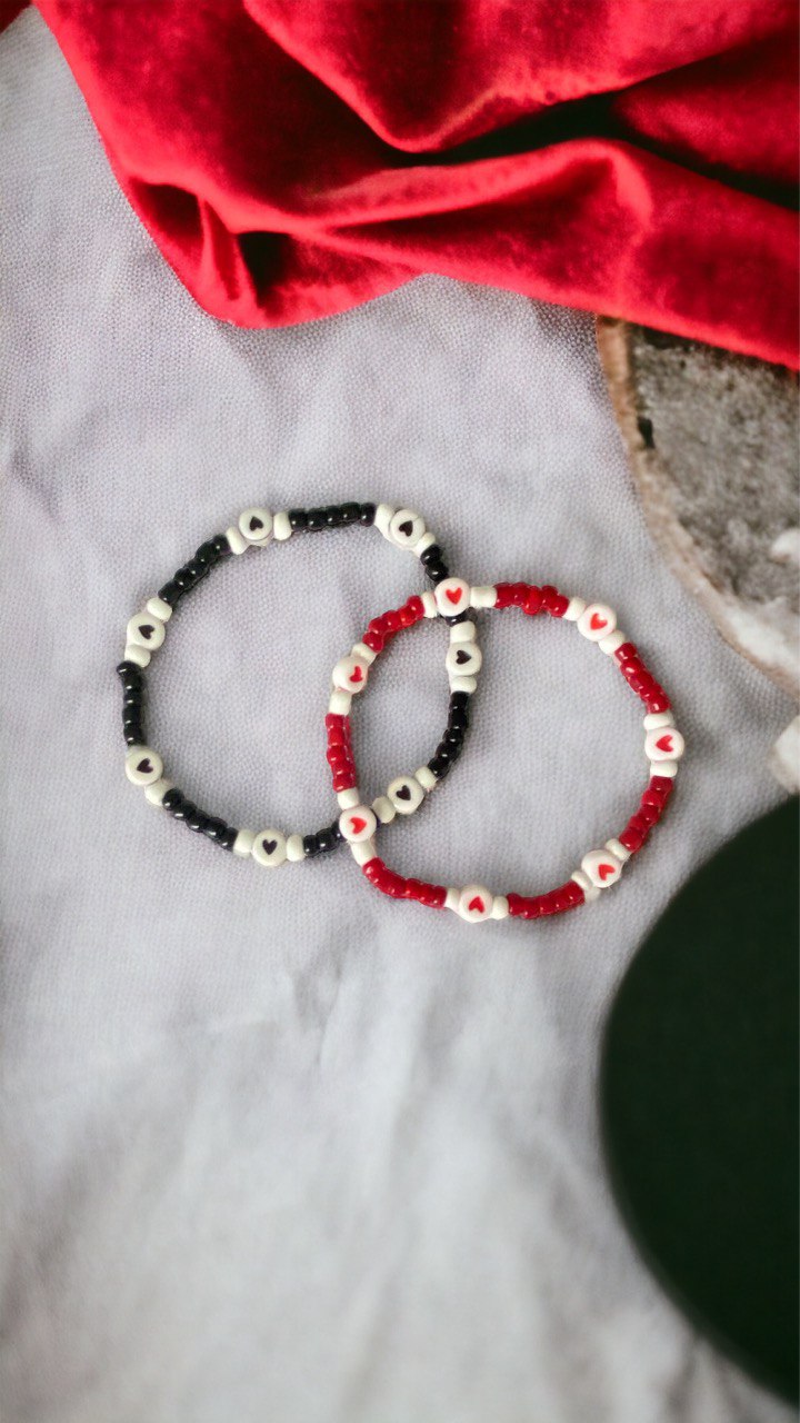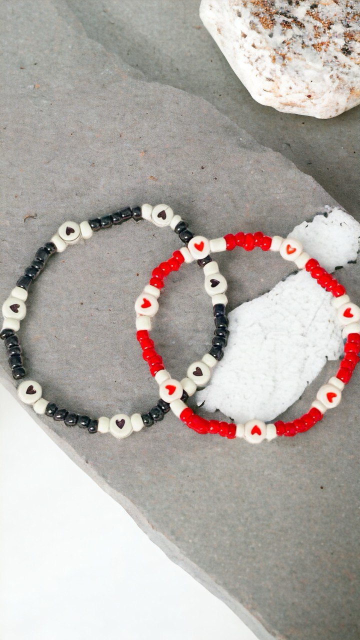 Conjunto de pulseras de cuentas de Chaquiron en tonos rojo, blanco y negro con lunetas de corazones de los mismos tonos de aproximadamente 16 cm de largo.