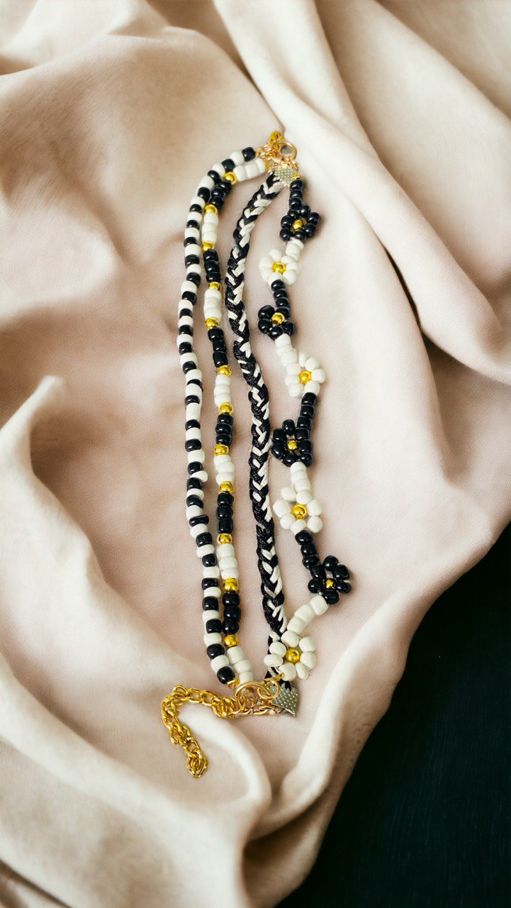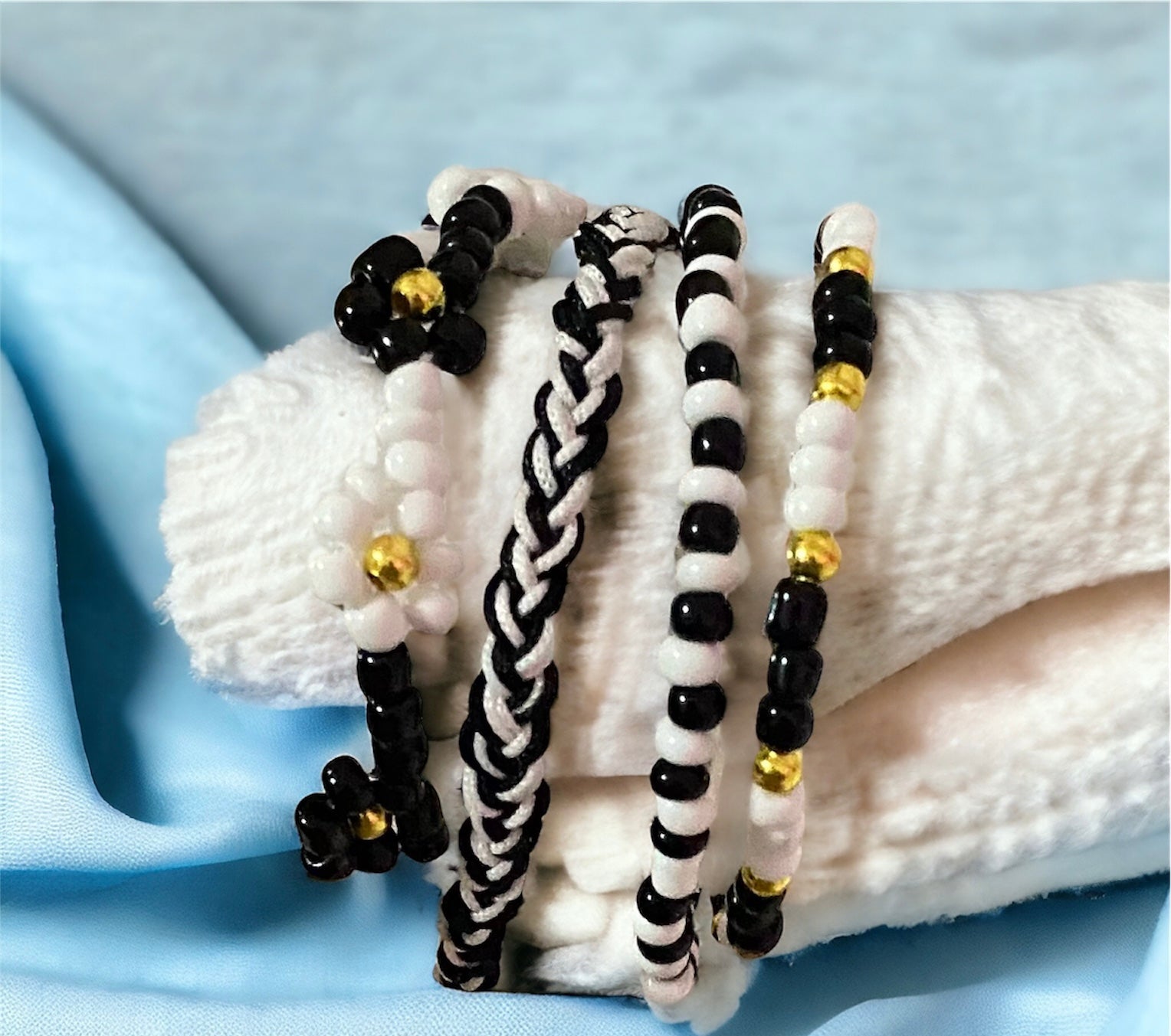 Pulseras de chaquirones en tonos blanco y negro en combinación de hilo chino trenzado de los mismos tonos a juego de aproximadamente 16 cm de largo con una extensión de 5 cm