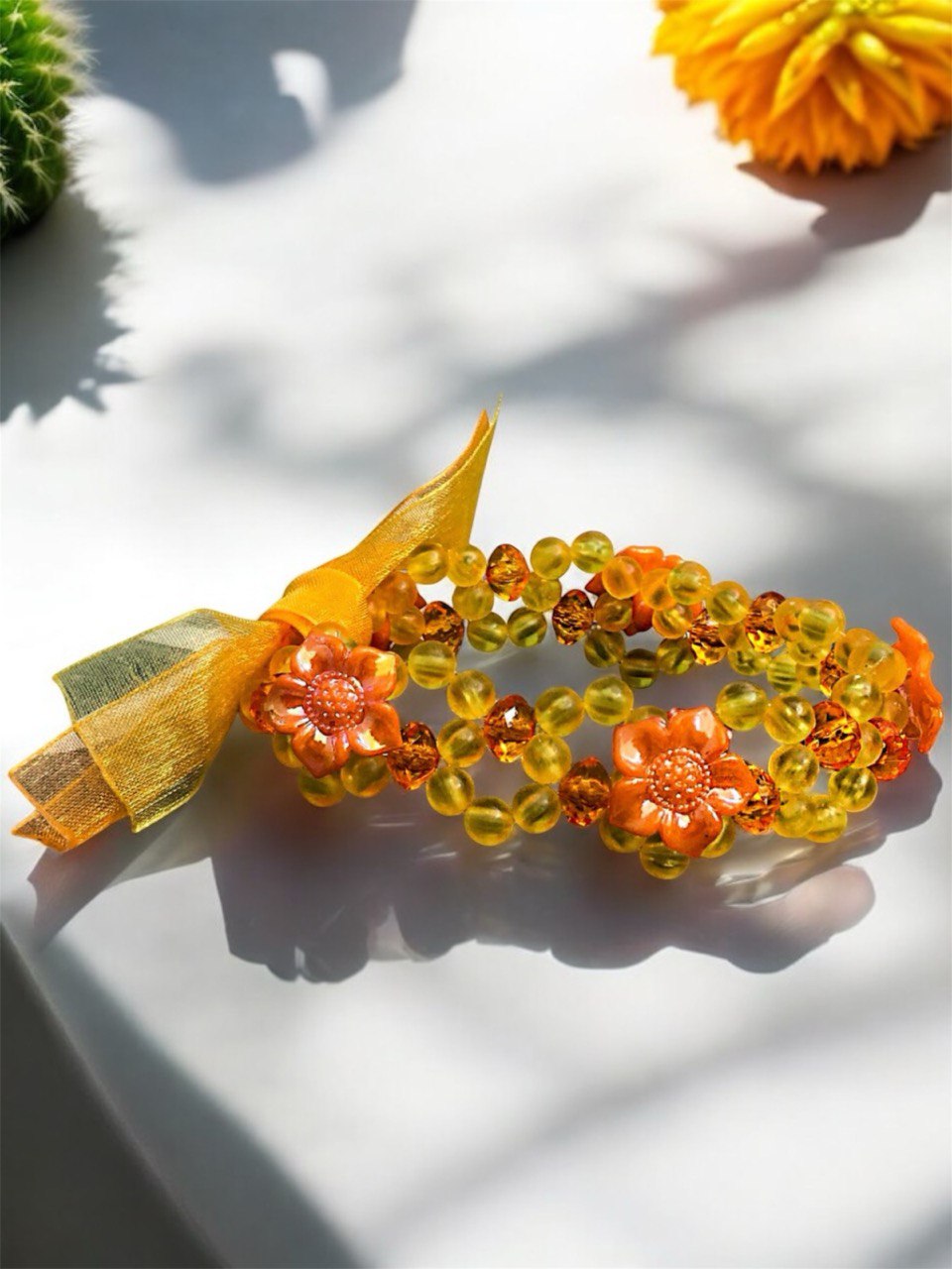 Pulsera de acrílico y plástico con hilo elástico de aproximadamente 16 cm de largo en color naranja adornado con un pequeño moño de listón del mismo color
