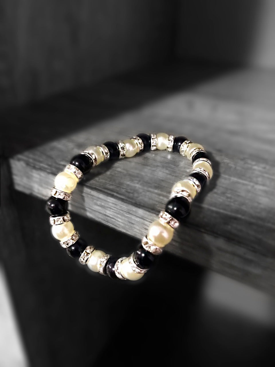 Pulsera de cristal y perlas, con cuenta espaciadora con diamantes de imitación incrustados e hilo elástico de aprox. 16 centímetros de largo, en combinacion de 3 colores negro, hueso y plata