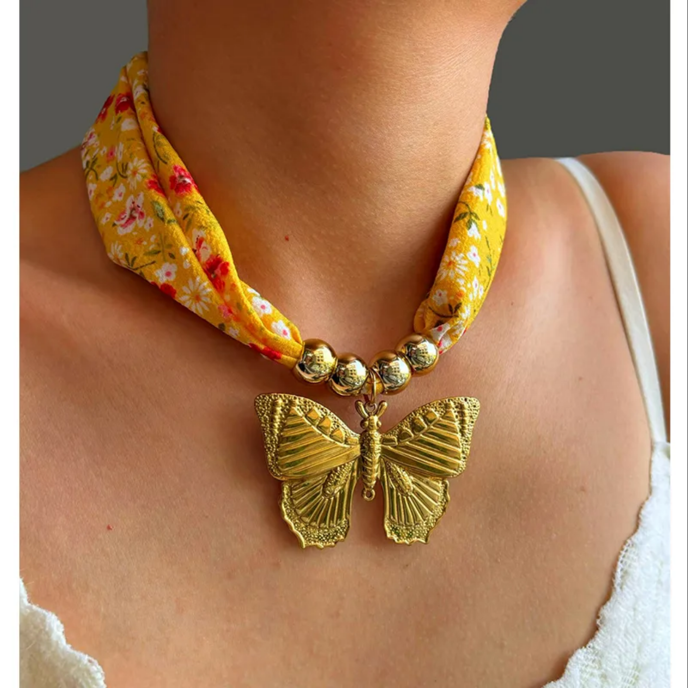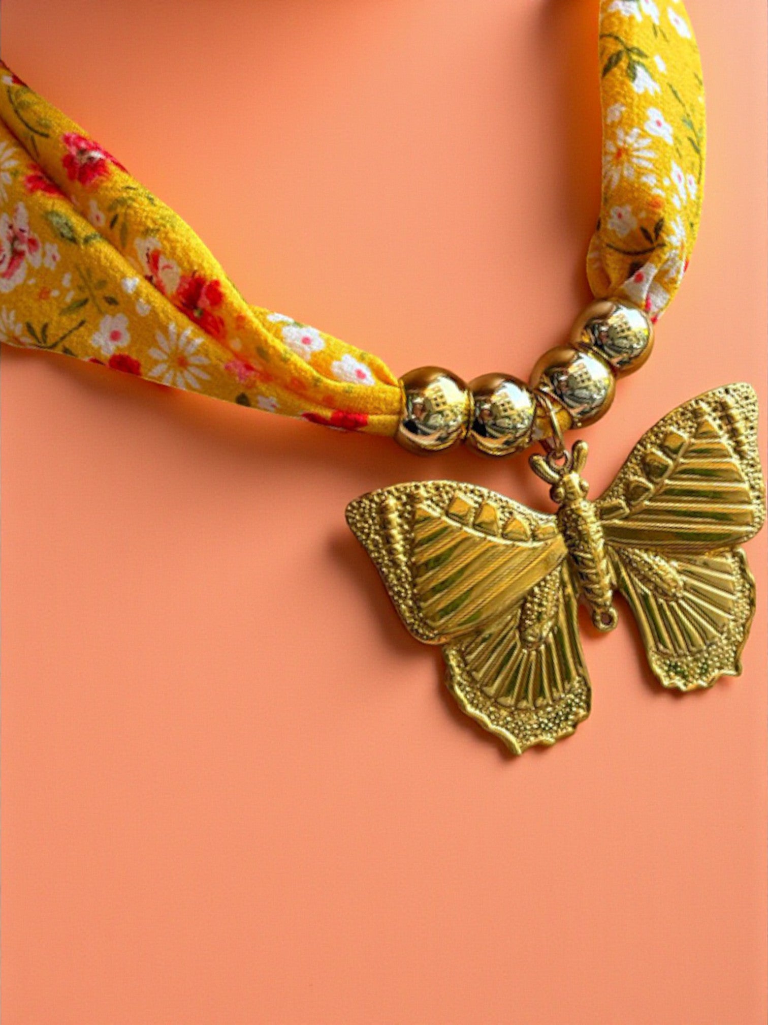 Un collar romántico con una mariposa dorada y tela floral que aporta dulzura y color. 🌼🦋 Su diseño combina textura, brillo y tonos cálidos para un estilo femenino y alegre. ✨💛 Ideal para primavera, verano y looks bohemios llenos de encanto. 🌿 La mariposa representa libertad, transformación y belleza natural. 💖 Una joya encantadora que añade vida y luz a tu outfit. ✨🌼