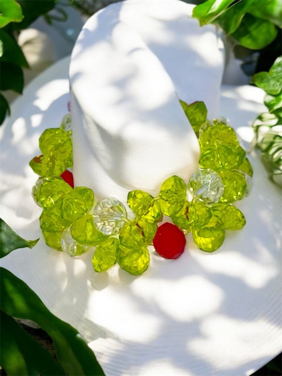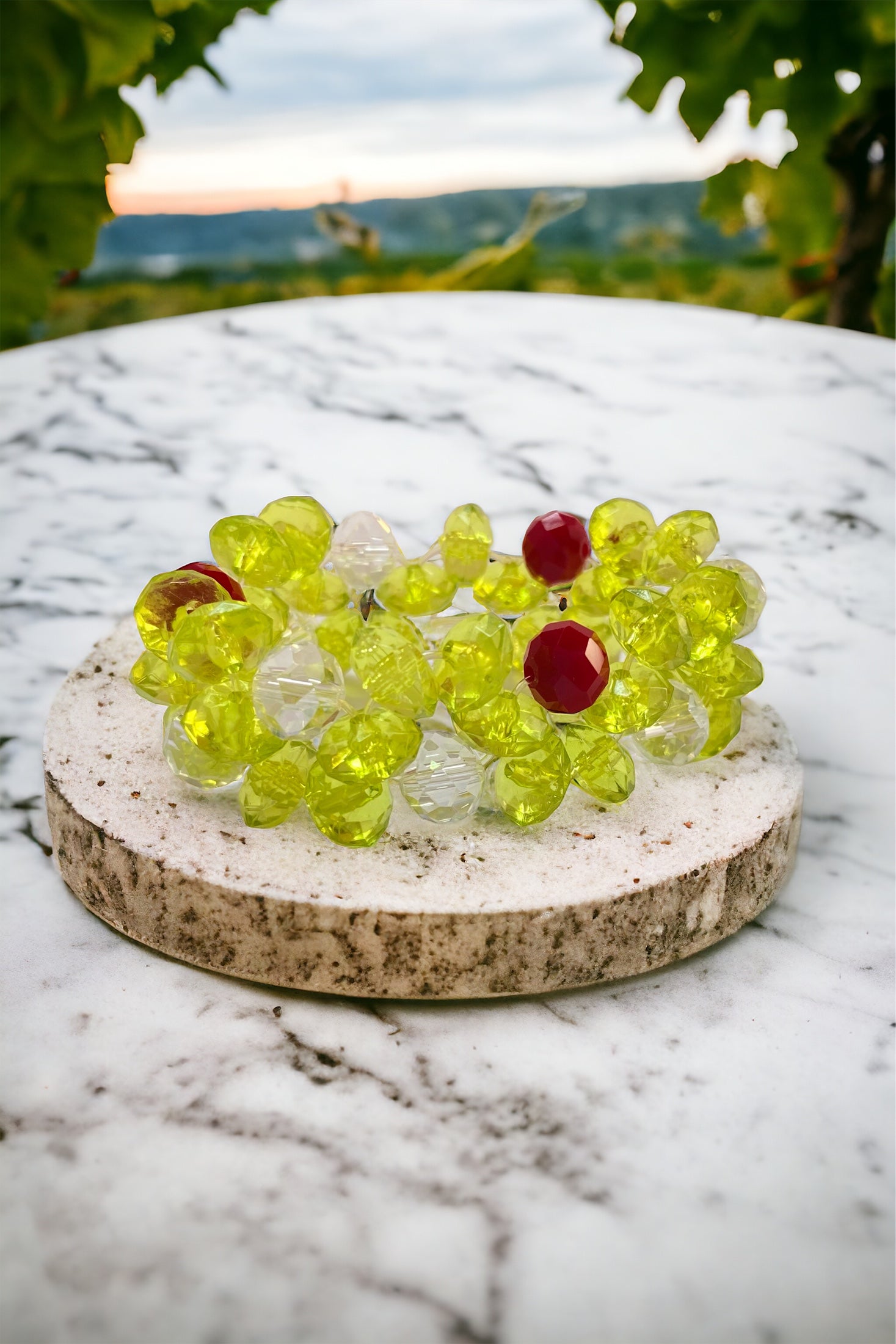 Pulsera de acrílico y cristal con hilo nailon de aproximadamente 16 cm de largo en color verde, rojo y transparente.