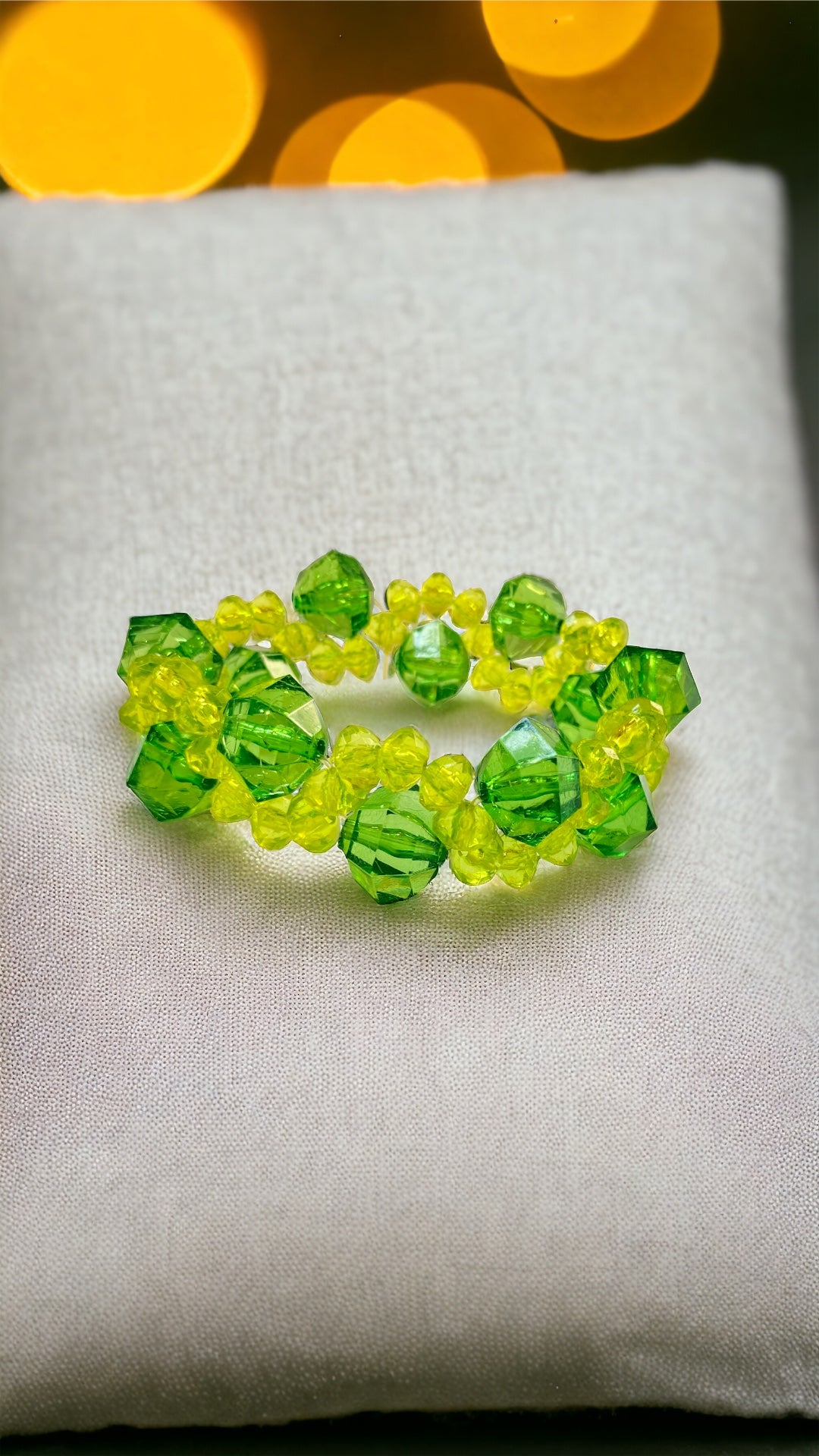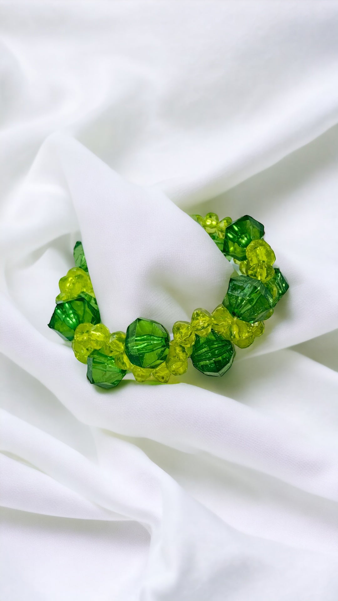 Pulsera de acrílico e hilo elástico de aproximadamente 18 cm de largo en color verde.