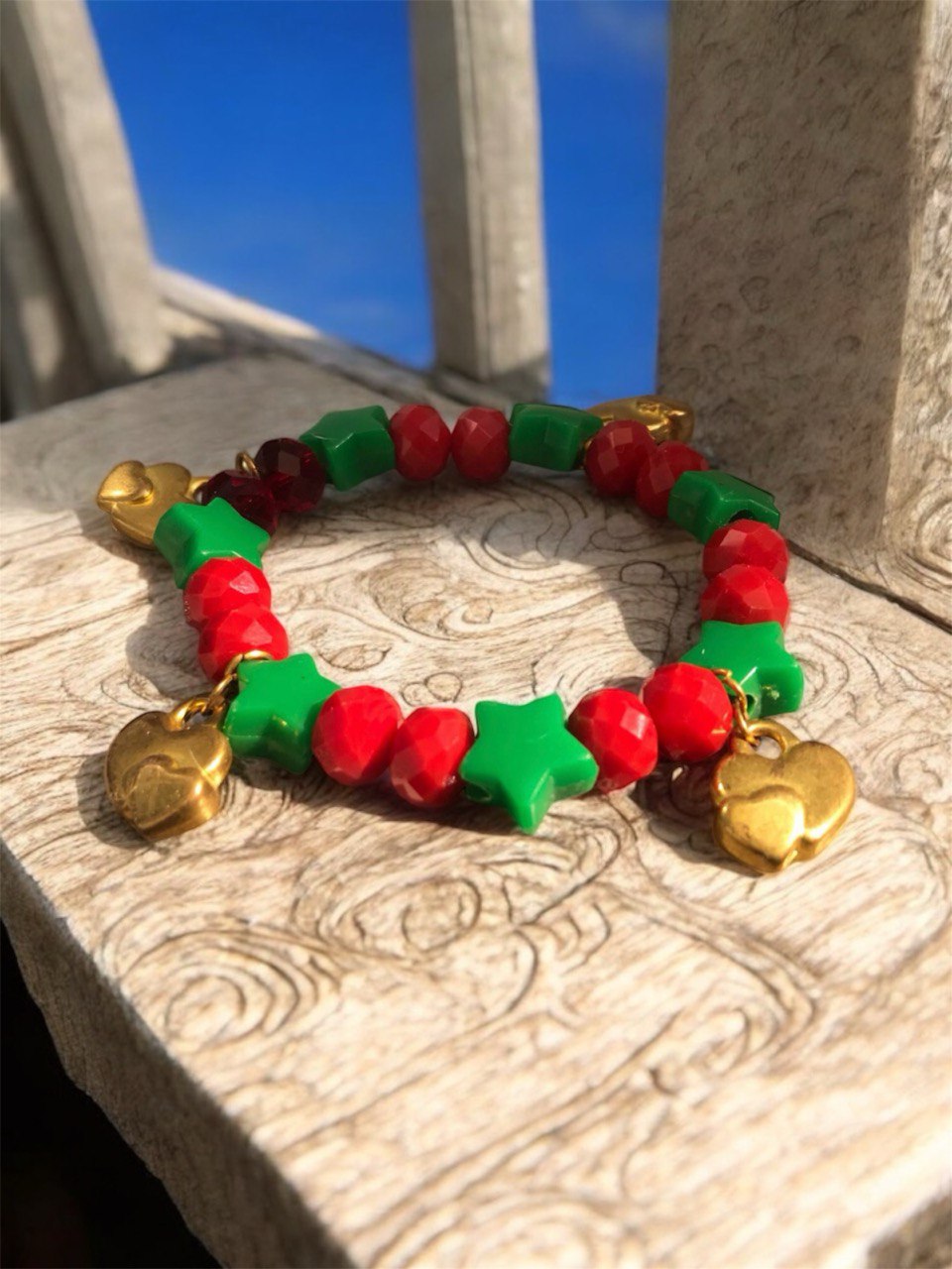 Pulsera de cristal y plástico con hilo nailon y dijes de plastimetal en color dorado de aproximadamente 16 cm de largo en colores rojo y verde.