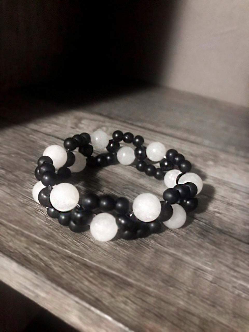 Pulsera de cristal e hilo elástico de aprox. 16 centímetros de largo, en combinacion de 2 colores Blanco y Negro