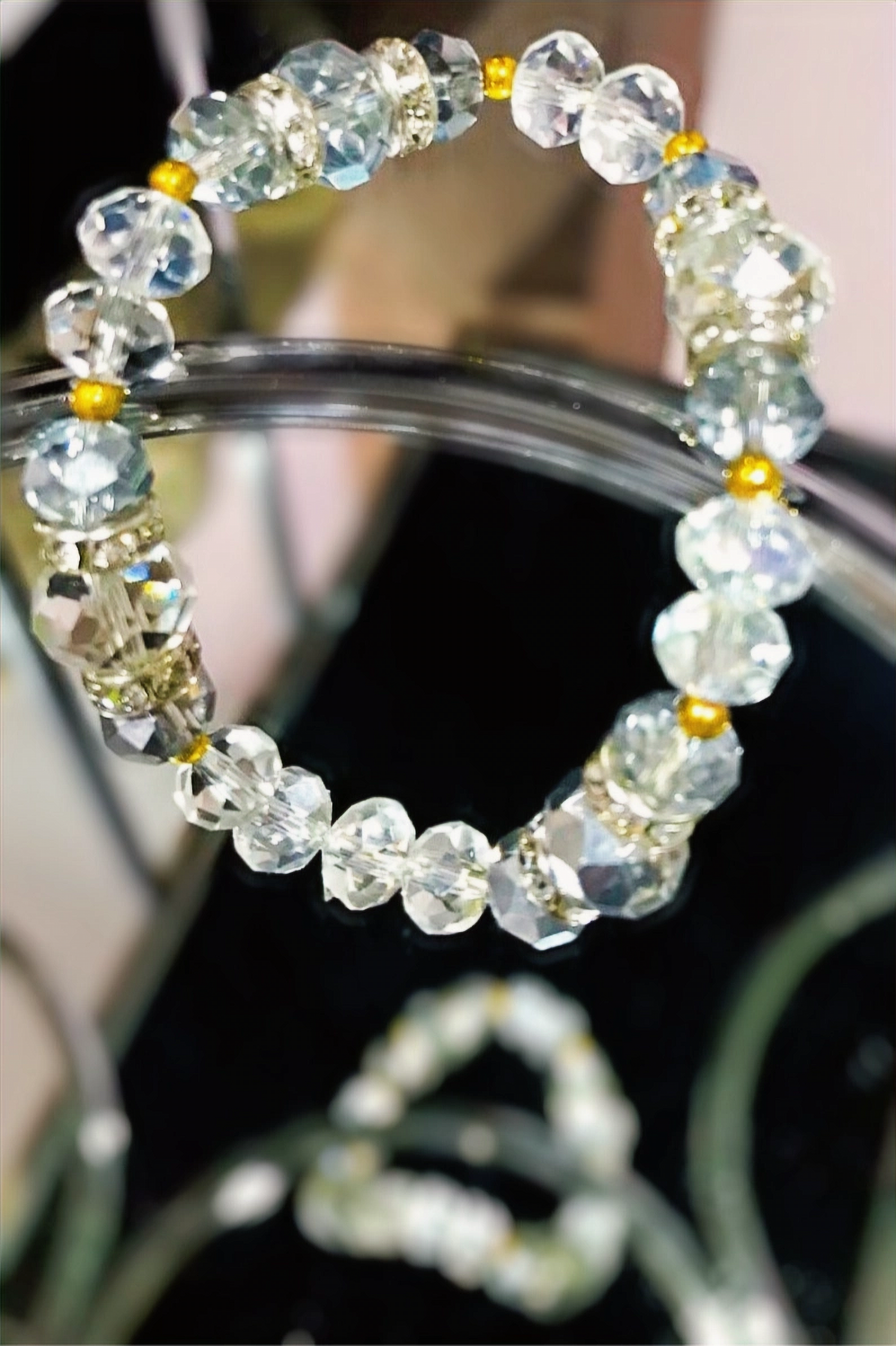Pulsera de cristal e hilo elástico de aprox. 14 centímetros de largo, en combinacion de 4 colores (Plateado, transperente, gris y dorado)
