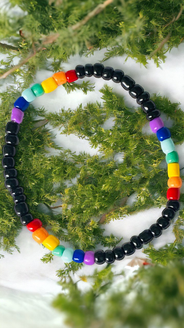 Pulseras de chaquirones en tonos del arcoiris con negro de aproximadamente 16 cm de largo.
